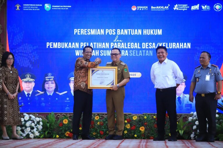 EMPAT LAWANG, PERSADAEKSPRES.COM- Bupati Empat Lawang Dr H Joncik Muhammad SSi SH MM MH menerima penghargaan dari kementerian Hukum dan Hak Asasi Manusia atas dukungan dan pembentukan Posko Bantuan Hukum di tingkat kelurahan dan desa. Penghargaan ini diserahkan langsung oleh Menteri Hukum dan HAM RI, Supratman Andi Agtas di Griya Agung Palembang, Selasa, (29/7/2025)